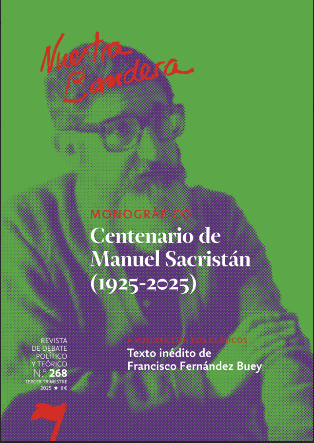 En consecuencia con esta necesidad de dotarnos de instrumentos teóricos desde los que sustentar nuestras propuestas políticas, este número de Nuestra Bandera, que va al encuentro de Manuel Sacristán para acercarnos a su evolución intelectual e ideológica, sus investigaciones y avances en el conocimiento de la realidad del sistema capitalista en nuestra época, pretende también dar algunas claves para comprender cómo el bloque dominante puede reaccionar ante las tensiones sociales que no es capaz de controlar recurriendo al fascismo y al militarismo como herramientas de control, haciendo que la disyuntiva que nos planteaba Rosa Luxemburgo entre socialismo y barbarie esté más viva que nunca.